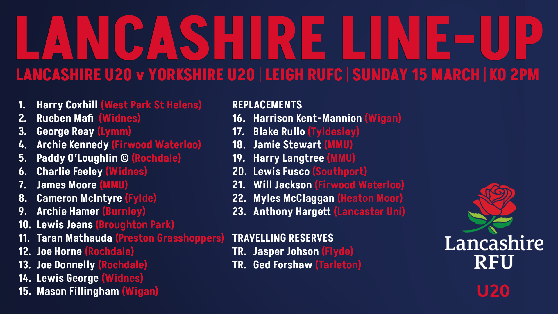 The Red Rose men will be looking to build on their performance in February, when Lancashire edged an end-to-end contest against Cheshire U20 at Lymm RFC, with a tries from Archie Hamer, George Reay, Joe Donnelly, Cameron McIntyre, Charles Feeley, Taran Mathuda and conversions from Lewis Jeans securing a 32-34 victory in the Jason Leonard U20s County Championship.