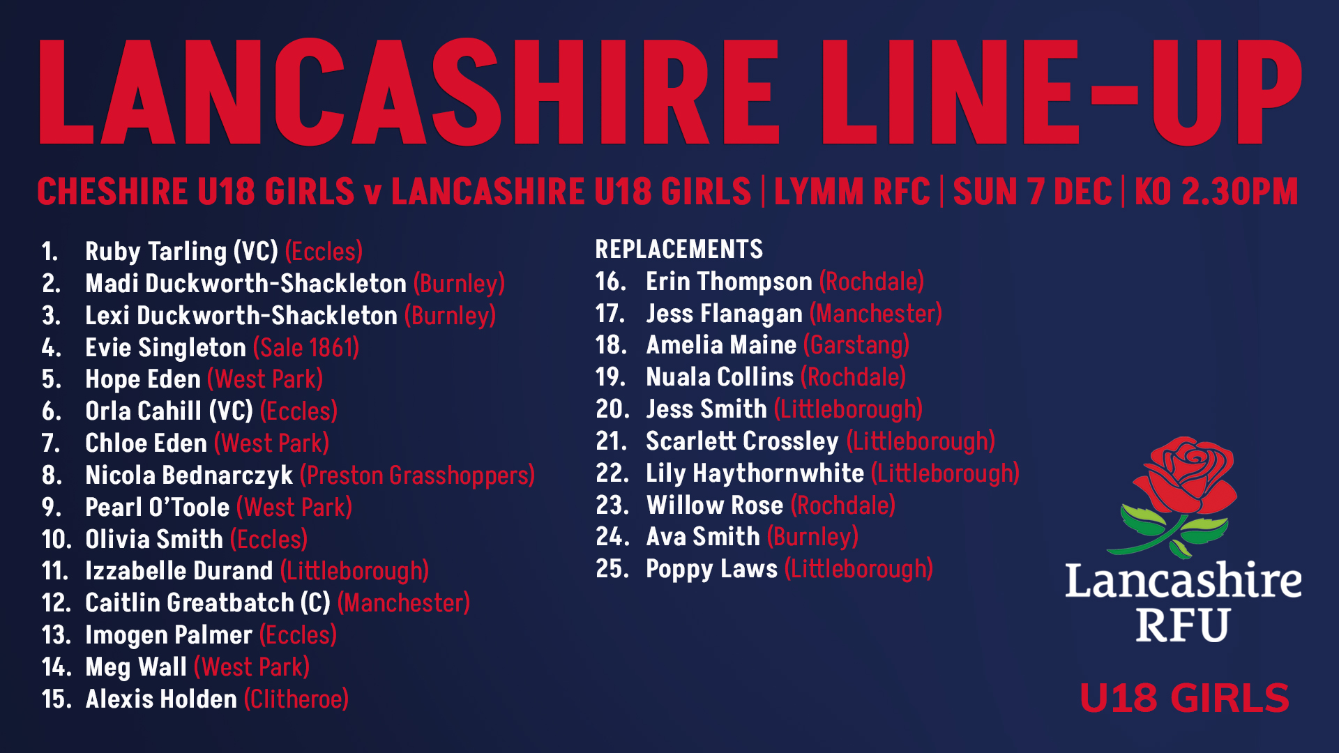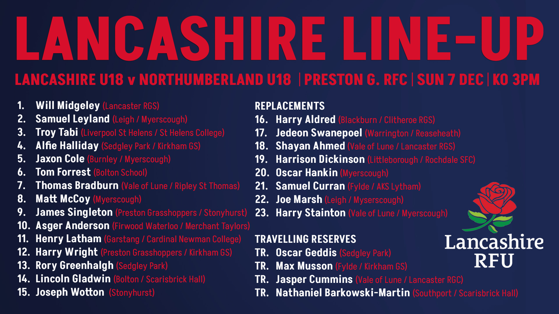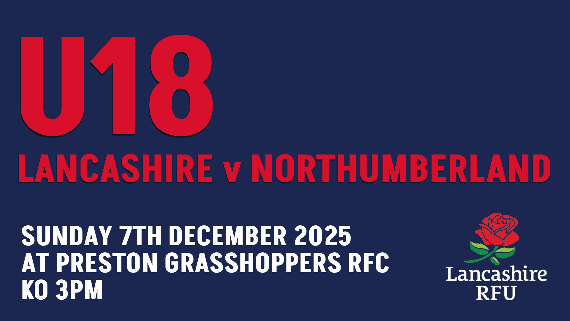 This Sunday 7th December we have a double whammy of Lancashire rugby with both our U18s and U18s Girls in action. If you want to see the future senior talent of the county, the full fixture details are published below. All support is welcomed.
